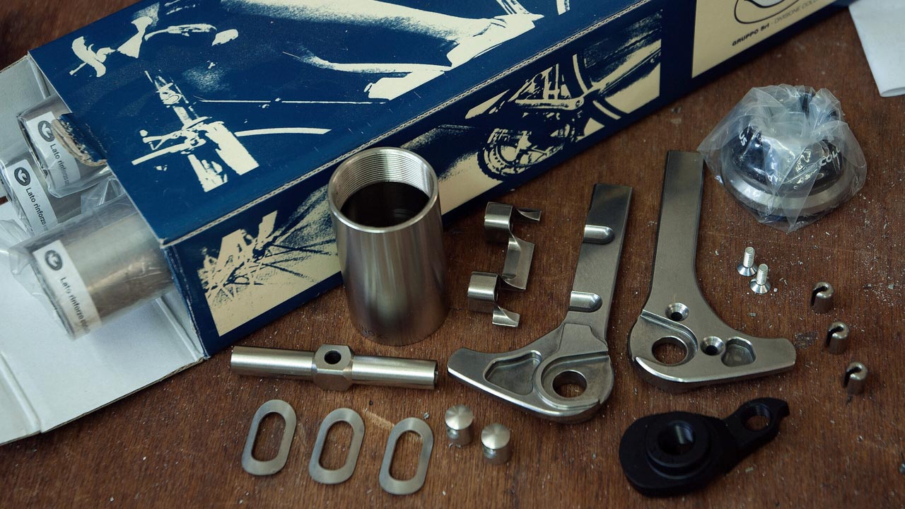 Columbus XCR stainless steel tubing, headset, Paragon Machine Works thru-axle flat mount dropouts, bottom bracket shell and cable guides ready for welding a custom Gravel Bike.