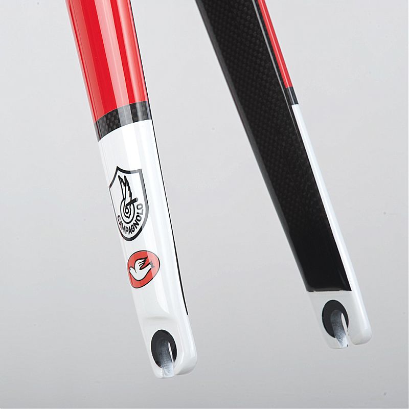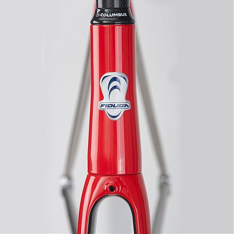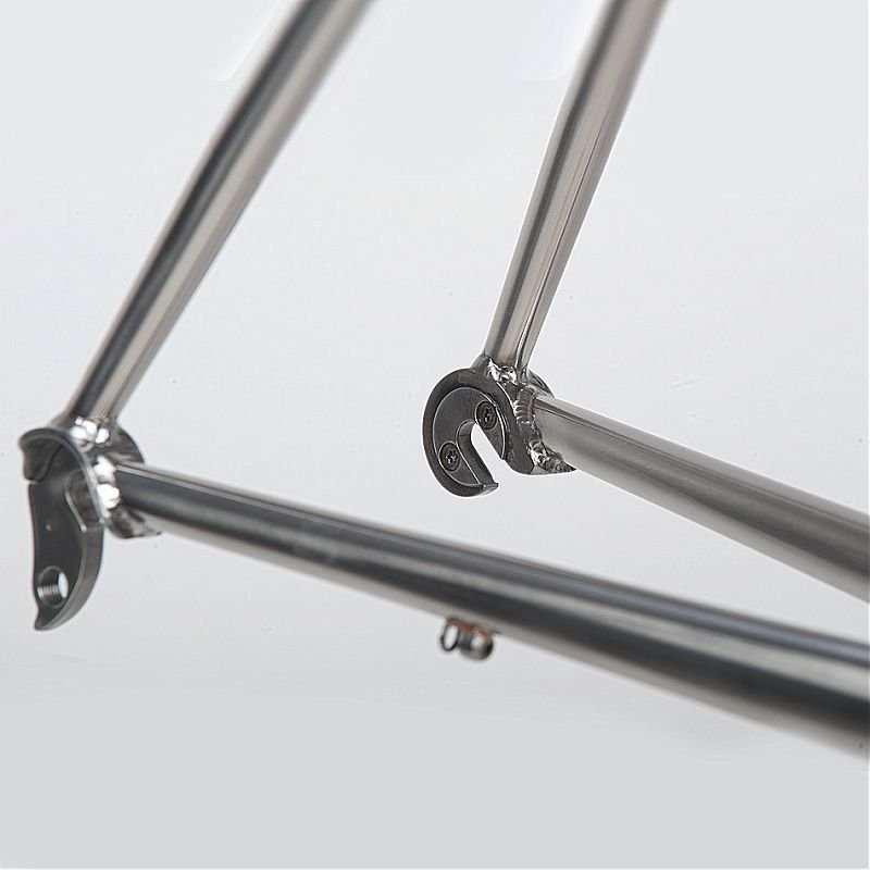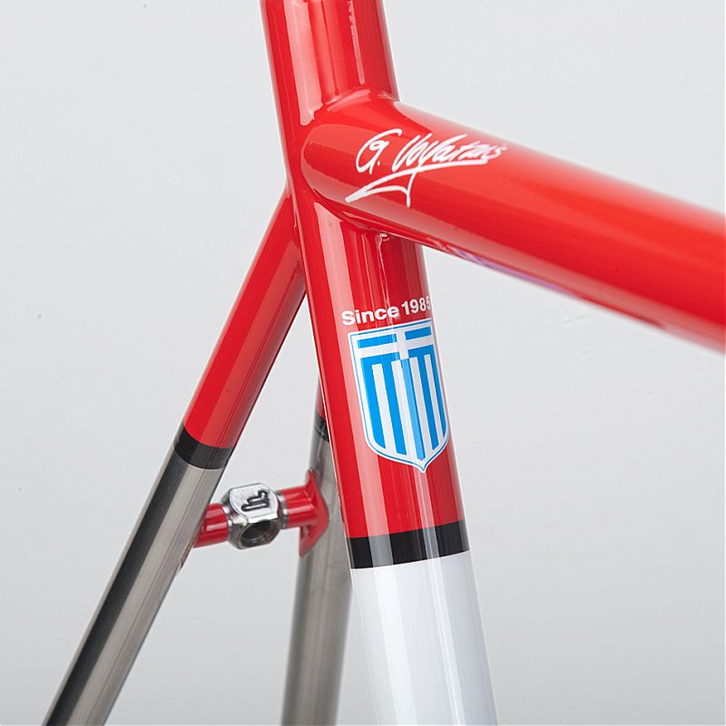 Τα πίσω ψαλίδια, η γέφυρα του φρένου και τα νυχάκια παρέμειναν στο φυσικό χρώμα του ανοξείδωτου. Τον σκελετό συμπληρώνει το carbon πιρούνι FEL της Columbus.